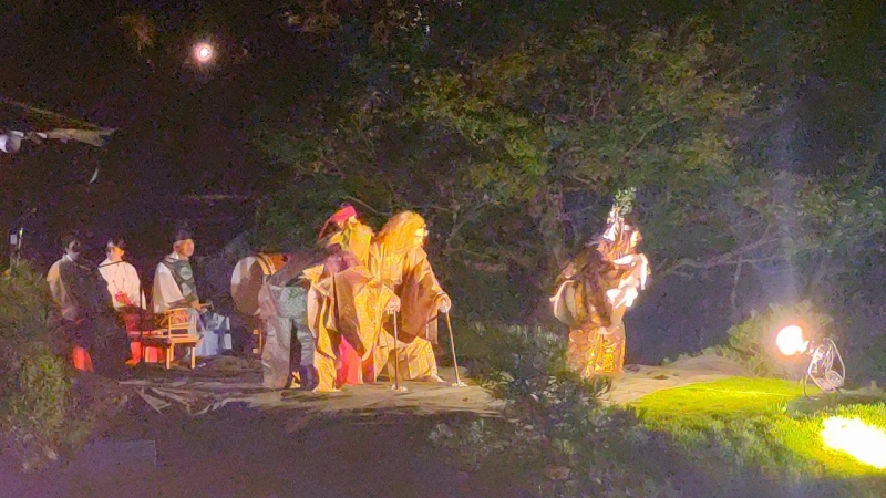 当日はライトアップやかがり火などが用意された趣のある景色の中で神楽は行われました。明かりがあるとはいえ、演者の皆さんは視界が良くなかったり移動に使える範囲が制限されたりなど室内で舞うのとは違いやりづらい面もあったかと思います。特に、オロチの尻尾の部分を移動させることは見ていて大変そうでした。ですが、神楽を見ていたツアー参加者は、昔からの伝統芸能を見ることができてよかったと思われたようです。