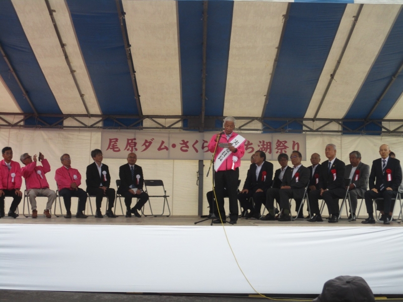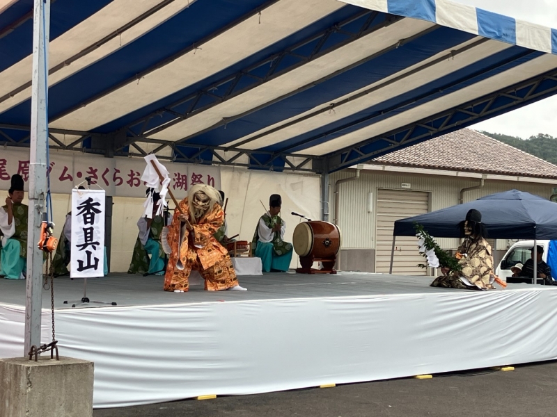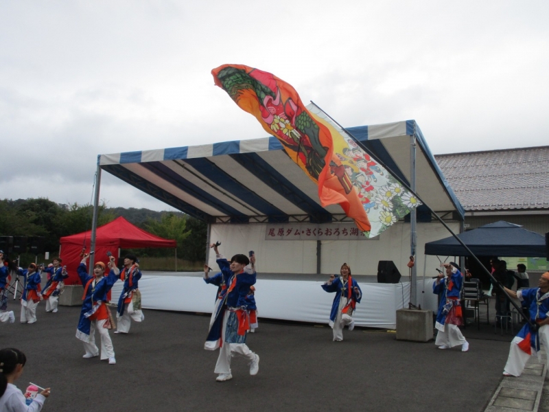 メイン会場のさくらおろち湖ボート競技施設に設置されたステージでは、横田高等学校吹奏楽部の楽しい演奏や、第11回さくらおろち湖写真コンテスト表彰式、さくらおろち湖環境美化活動参加協力団体の表彰、掛合太鼓ジュニアによる『太鼓』の演奏、TEAM輪音天咲の『よさこい踊り』、奥出雲神代神楽による『神楽』と、盛りだくさんでした。それぞれの演目が始まると、来場したたくさんの方々はステージに見入っていました。