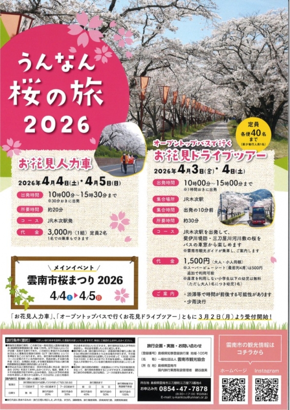 【イベント案内】うんなん桜の旅2026 4月初旬、雲南市で『うんなん桜の旅2026』が開催されます。屋根のない2階建ての「オープントップバスで行くお花見ドライブツアー」と普段は走っていない「お花見人力車」を楽しむことができます。どちらも4月の時期ならではの桜を楽しむことのできるイベントです!申込みは3月2日(月)から行われます。 ★イベントの詳細はコチラ★ さくらおろち湖周辺を100%楽しむサイトで見る
