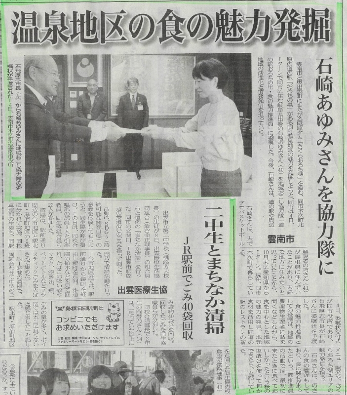 【道の駅おろちの里】地域おこし協力隊の方のことが取り上げられました 11月9日(日)の島根日日新聞で、雲南市から地域おこし協力隊の方に業務を委託されたことが取り上げられました。温泉地区の食の魅力を発掘し、地域の活性化と情報発信を行っていく業務です。地元の食材を生かした料理の開発など、どのようなものができるのか楽しみですね。 さくらおろち湖周辺を100%楽しむサイトで見る