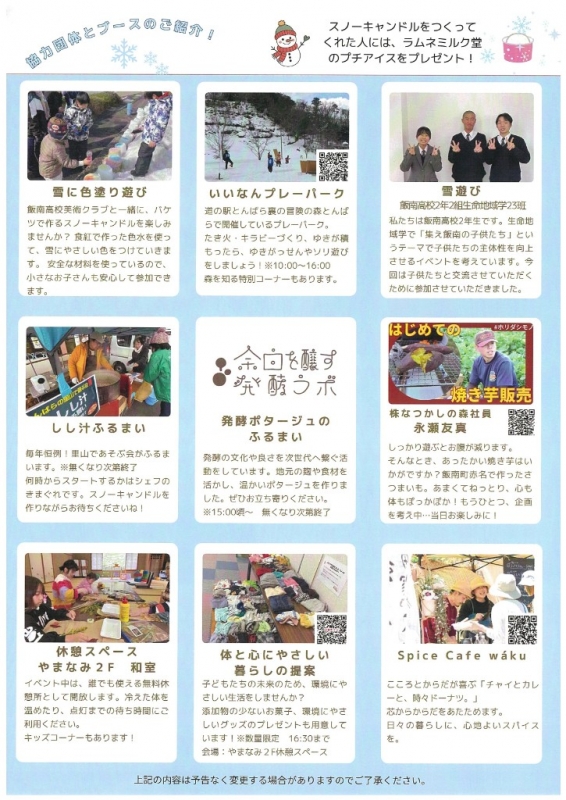 【イベント案内】作って灯そうスノーキャンドル 1月31日(日)、飯南町の道の駅頓原にて『作って灯そうスノーキャンドル』のイベントが開催されます。 チラシの写真を見ると、暗い場所でのスノーキャンドルはとてもきれいに灯っています。ま様々な雪遊びも楽しめます!温かい食事の販売もありますよ。 ★イベントの詳細はコチラ★ さくらおろち湖周辺を100%楽しむサイトで見る