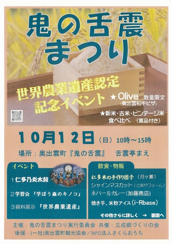 10月12日(日)、奥出雲町にある鬼の舌震にて、『鬼の舌震まつり』が開かれます。世界農業遺産認定を記念したイベントです!このお祭りでは、お米の食べ...