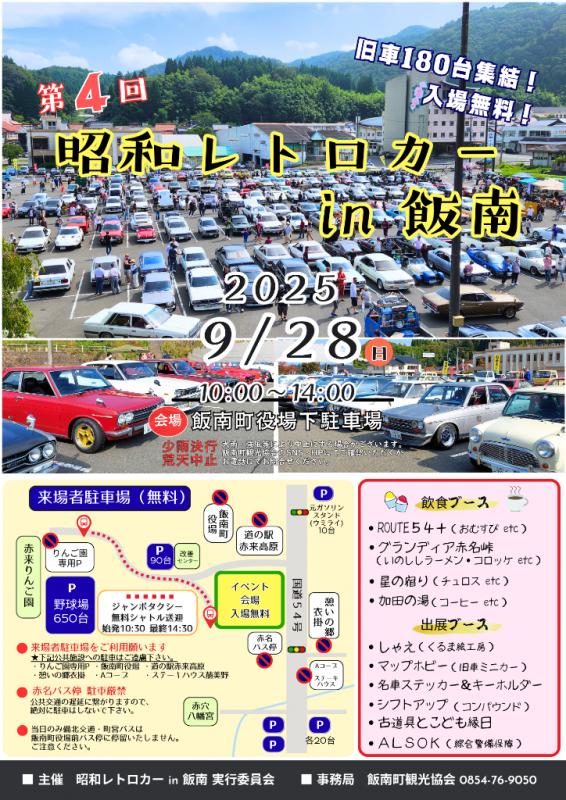 9月28日(日)、飯南町にて『第4回昭和レトロカーIN飯南』が開催されます。 全国各地から、約180台もの昭和の車が大集結!!飲食ブースや車に関する出展ブ...